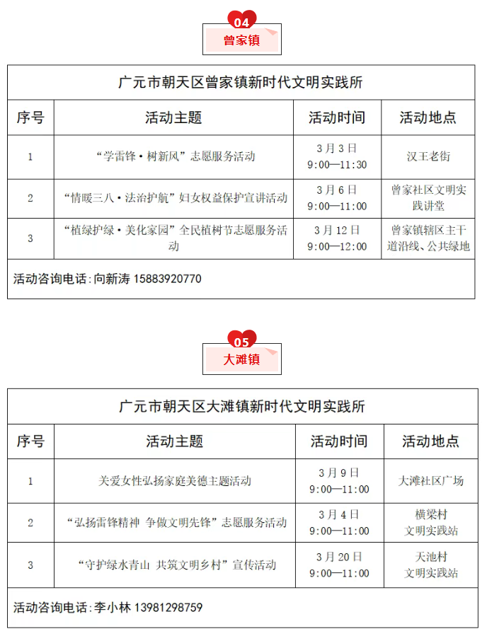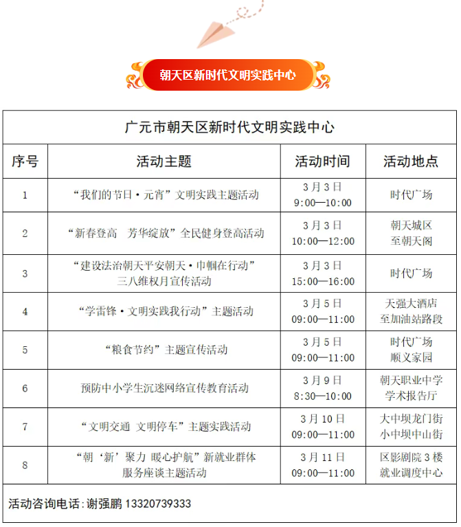 为推动新时代文明实践活动提质增效,充分发挥新时代文明实践中心(所、站)作用,现将朝天区新时代文明实践中心(所、站)2026年3月份部分活动计划清单公布如下,欢迎广大群众积极参与。