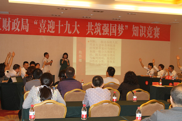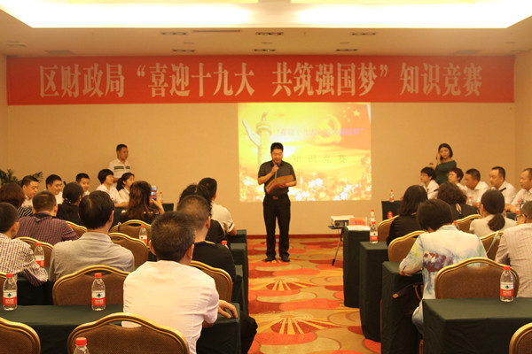 为深入贯彻落实省市财政工作会议精神,在全区财政系统扎实开展“两学一做”学习教育常态化制度化,9月22日上午,区财政局开展了“喜迎十九大,共筑强国梦”知识竞赛活动,全局干部职工,以党支部为参赛主体,局工会、共青团、妇委会全力协作,选派2支队伍参赛,全局近50余人参加了本次活动。区直机关工委、区总工会、团区委、区妇联相关领导应邀出席活动。