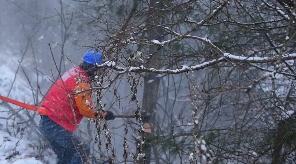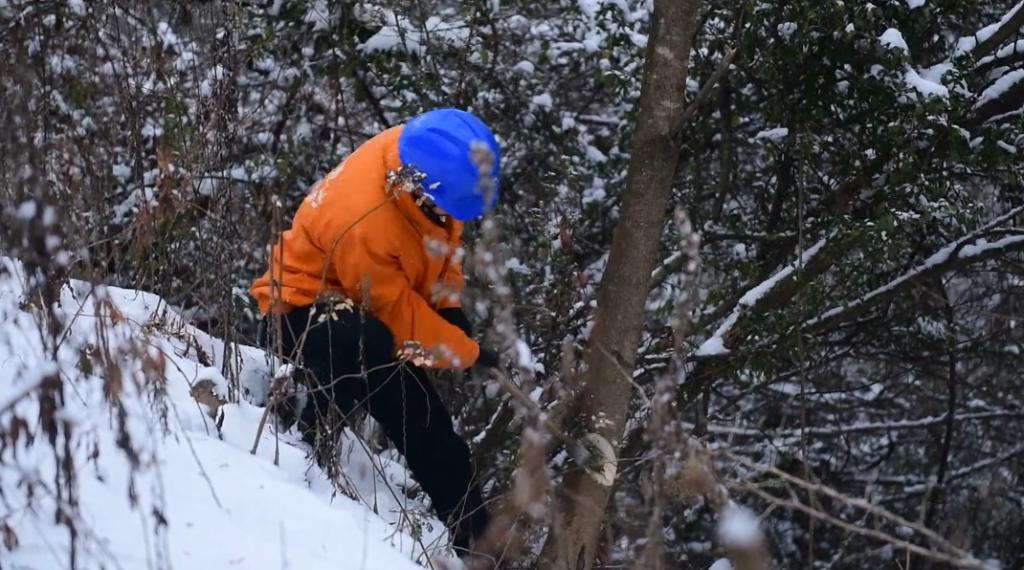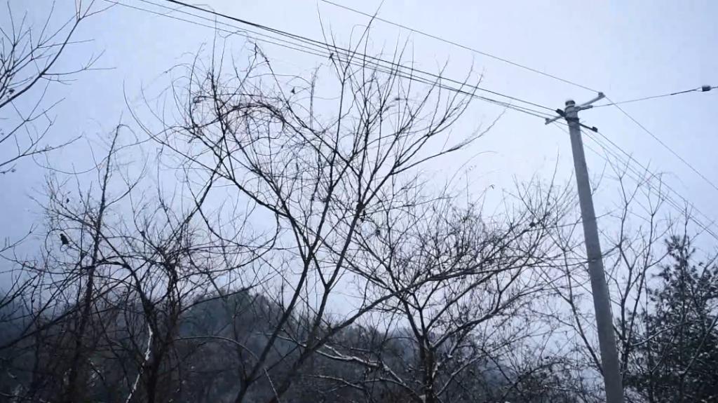 处理完台区故障剩下下的3名师傅又开始了线路隐患的巡视,在公路的悬崖边上,发现了即将触碰导线的超高树木。“看嘛!这树枝已经侵线了,(可能)导致线路短路,要把它清楚掉。”沿着曾家供电所电力员工向德军视线望去,悬崖边上,几棵树的枝丫已然将电线围住,必须立即清理。但雪天脚下湿滑,工作开展起来很是费力。