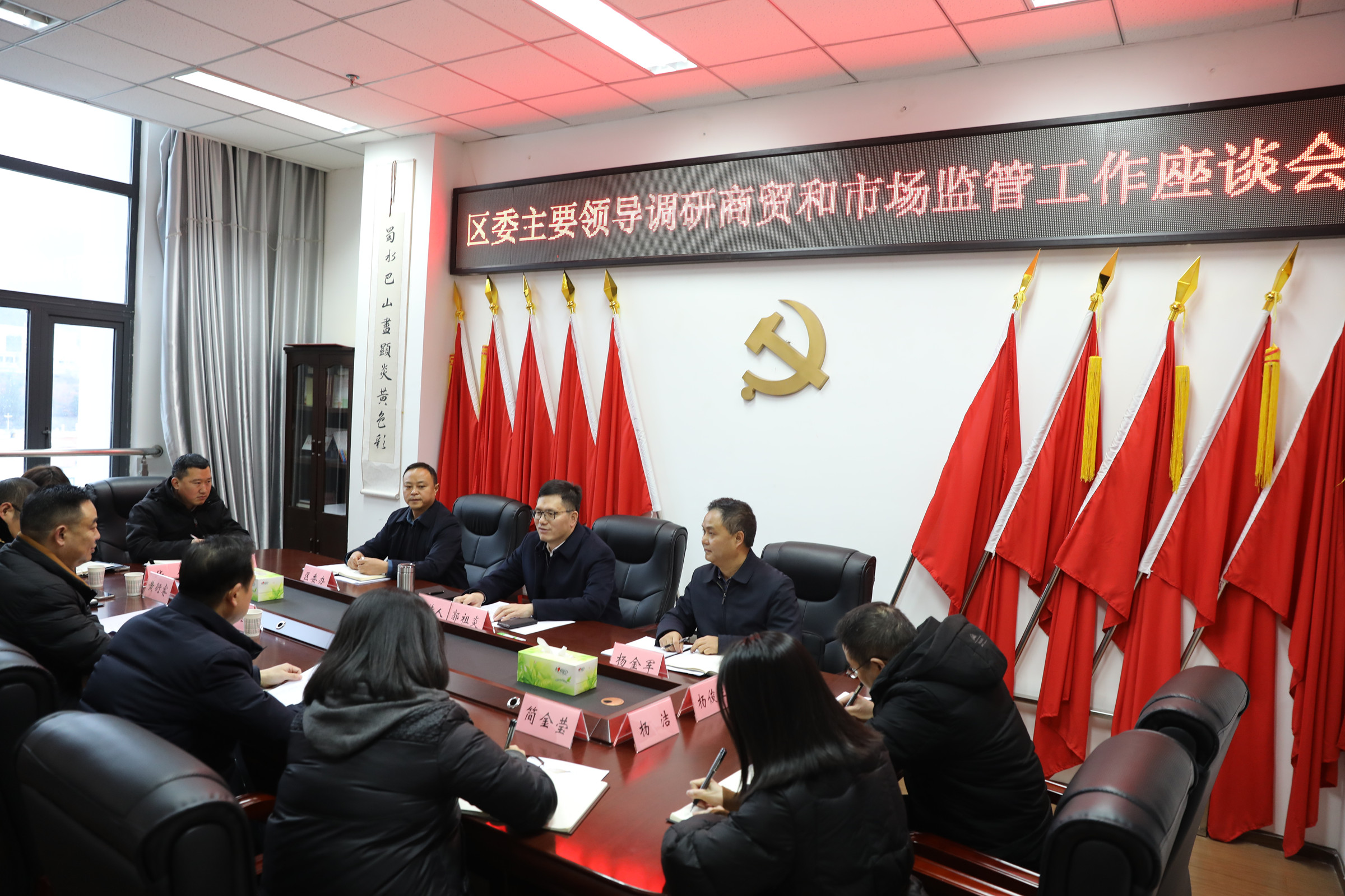 本网讯(王杰)1月29日下午,区委书记郭祖炎专题调研全区商贸和市场监管工作。他强调,要深入学习贯彻党的二十大关于“构建高水平社会主义市场经济体制”的部署要求,进一步压实责任、细化举措、狠抓落实,推动商贸物流与市场监管同频共振,切实保障春节期间市场供应充足、价格稳定、安全有序,为我区经济社会高质量发展作出更大贡献。