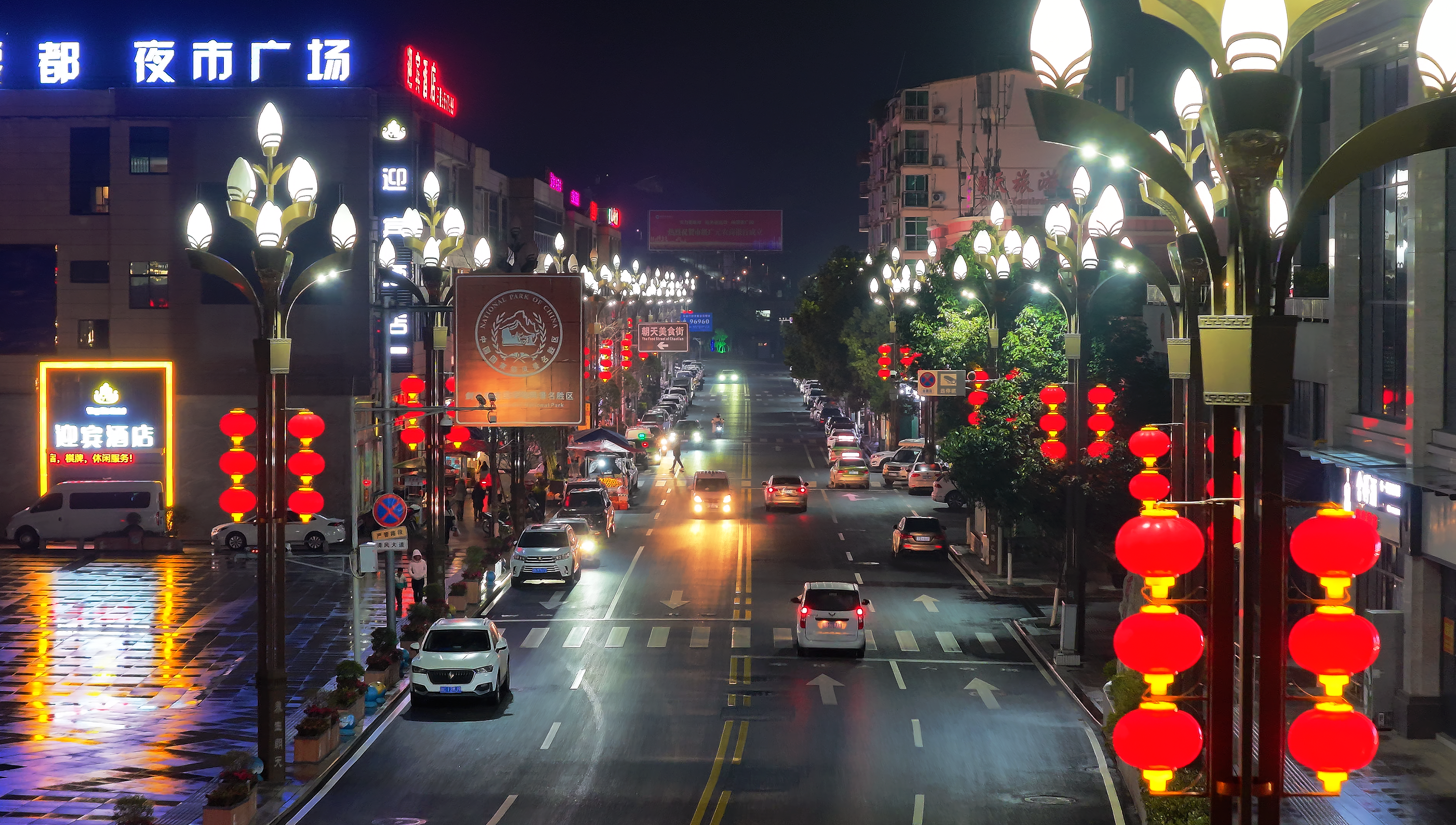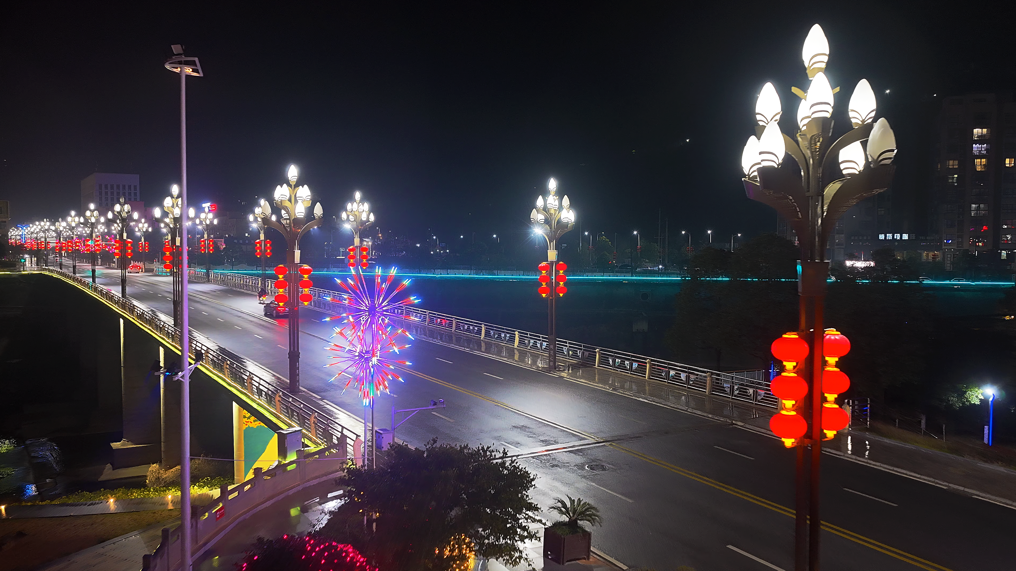 夜幕降临,华灯初上,城区各处灯光次第点亮,流光溢彩的灯带勾勒出城市轮廓,主题灯展与波光粼粼的嘉陵江、潜溪河相互映衬,璀璨夜景如梦如幻,让整个小城都沉浸在喜庆祥和的节日氛围中,尽显“烟火气”与“时尚范”。