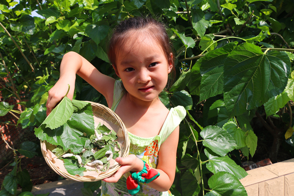 “我们住在城里面,这还是第一次见到蚕呢!”6岁的胡乔雅把桑叶放进装蚕的小篮子里,看着蚕宝宝狼吞虎咽,再也舍不得放下,看着孩子的认真劲儿,她妈妈也蹲下身子,帮她喂蚕宝宝。