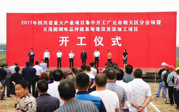 本网讯(王莉萍)9月22日上午,2017年四川省重大产业项目集中开工广元市朝天区分会场暨天茂圆调味品种植基地建设及深加工项目开工仪式在朝天区七盘关工业园区举行。市委常委、区委书记蔡邦银出席仪式并宣布项目开工。区人大常委会主任梁黎出席仪式。区委副书记罗凌云出席仪式并致辞。区委常委、区委办主任刘剑波主持仪式。