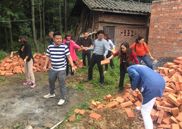 区住建局帮扶干部在小安乡全胜村帮助贫困户搬运修建房屋用砖