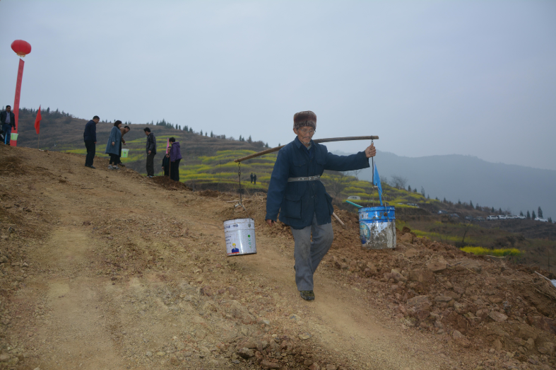 今年3月12日植树节,一位朝天老人肩挑水桶走在取“定根水”的路上。作者:孙涛泉