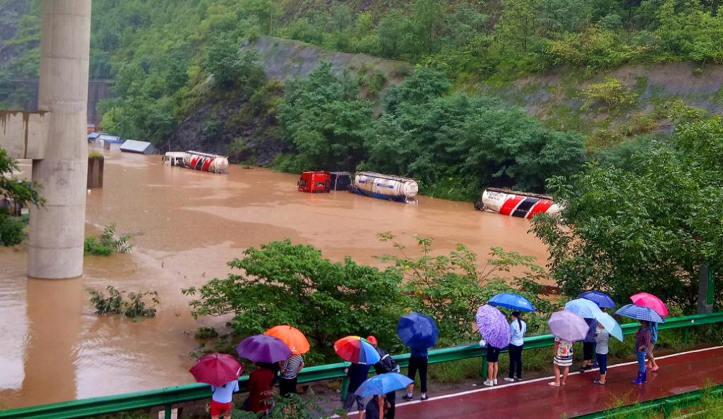 朝天镇楼房村,三辆罐车和牵引车被洪水淹没
