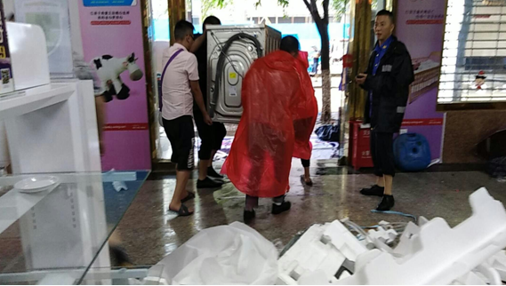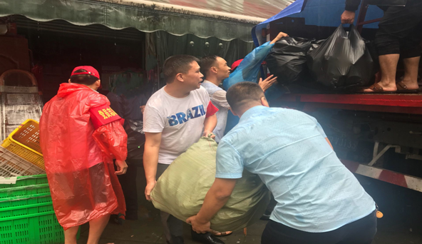 区食品药品和工商局组织党员干部帮助商铺紧急转运电器设备。