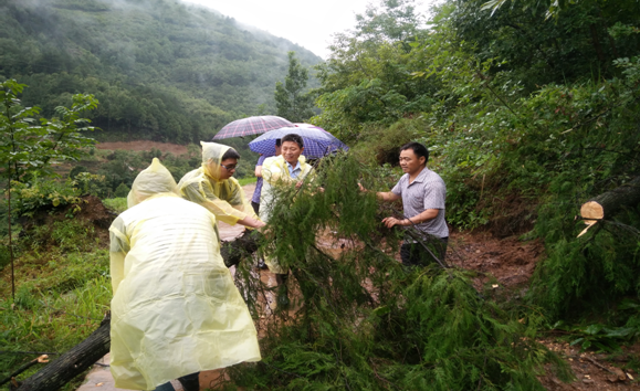 区法院组织党员干部奔赴帮扶的马家坝乡险峰村核灾查灾,帮助群众疏通道路。