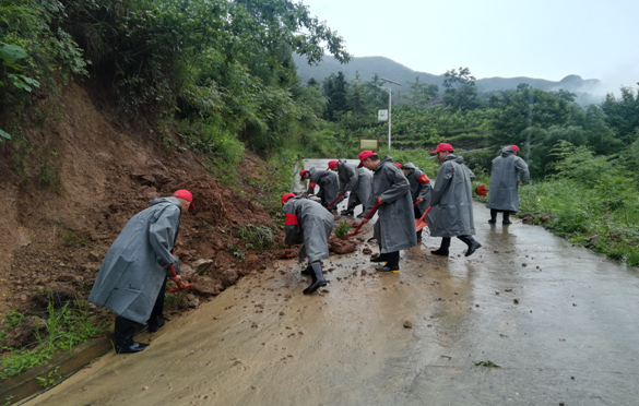 文安乡党委组织共产党员应急抢险突击队辖区清理垮塌公路,疏通水渠。