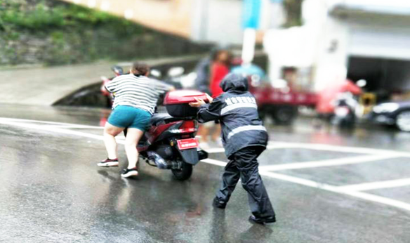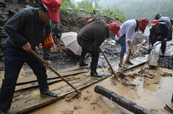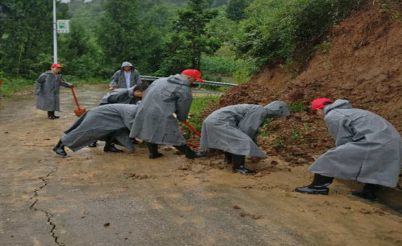 李家乡党委组织党员干部与群众开展抗灾自救,冒雨抢修道路。