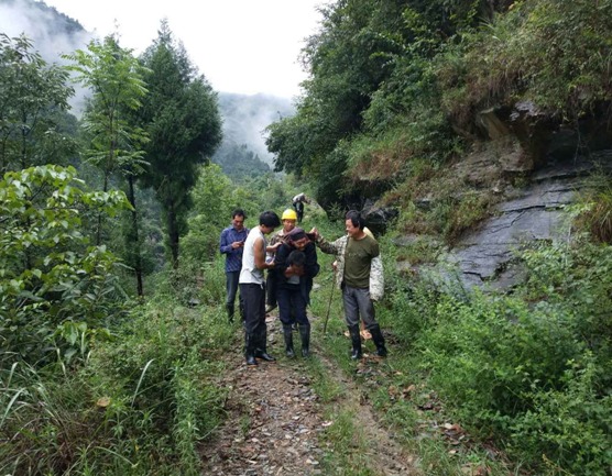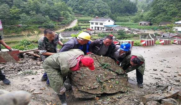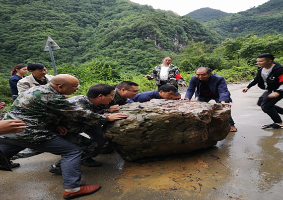 小安乡共产党员应急抢险突击队冒雨疏通朝小路危崖坠石路段,确保群众出行安全。