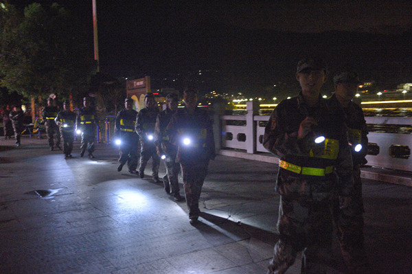 “马上有一次洪峰经过,请大家注意安全,立即退出警戒线内。”11日晚22时,大中坝沿嘉陵江一线由于受洪灾影响临时断电,一支十人民兵小分队沿江巡查,并耐心劝退沿线观水的所有群众。民兵向金玉告诉记者,他们队伍将整夜值守巡查,全力保障人民群众安全。