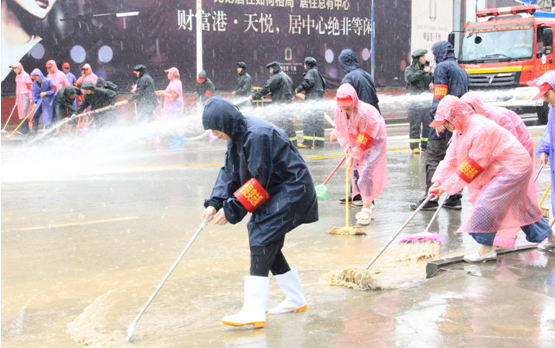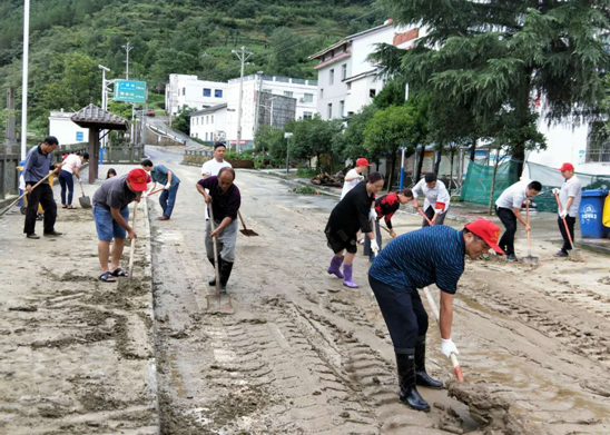 朝天镇、区公安分局组织共产党员应急抢险突击队清理街道淤泥。