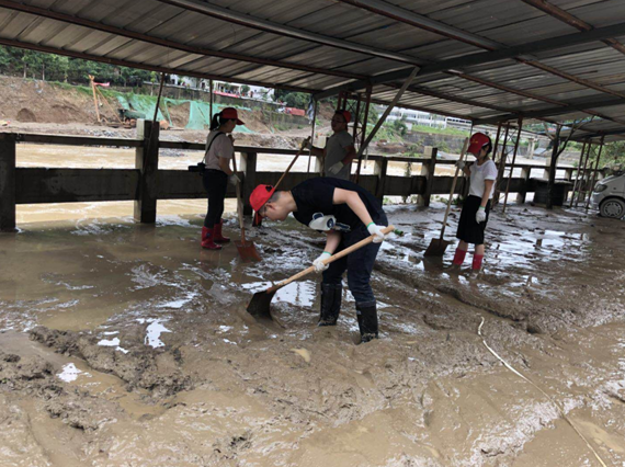 区纪委、区扶贫移民局、区城管局组织共产党员应急抢险突击队清理同乐园淤泥。