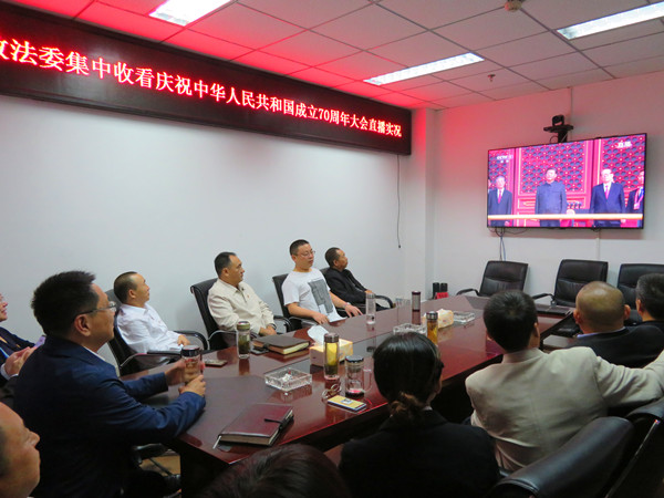 2019年10月1日上午10点,区委常委、政法委书记李绍兵组织区委政法委全体党员干部集中收看庆祝中华人民共和国成立70周年大会直播,共同体验祖国70华诞的伟大时刻。