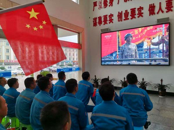 上午10时,在海螺水泥有限责任公司的大厅内坐满了党员和工人代表。大家屏气凝神,一边收看一边记录。此外,该公司的工作车间里,工人们也纷纷放下手中的活儿,开始收听收看国庆庆典。