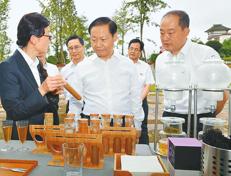 雅安茶叶资源丰富,拥有国家级茶树良种繁育场和西南地区最大的茶树基因库。在雅攀共建蒙顶山茶产业园,彭清华沿着茶山小道步行来到牛碾坪现代茶叶科技中心,详细了解蒙顶山茶种植历史、制作工艺、生产流程、品牌打造和百公里百万亩蒙顶山茶种植带建设、茶旅融合促进乡村振兴、茶产业发展带动群众就业增收等情况。彭清华说,雅安气候宜人,植茶历史悠久,茶文化底蕴深厚。要结合实施乡村振兴发展战略,充分发挥得天独厚的自然生态优势,以市场需求为导向,加快工艺改良和产品创新,大力发展精深加工,不断提升蒙顶山茶品牌的知名度美誉度和市场占有率。要积极推进文旅融合、茶旅融合,带动更多群众特别是贫困群众就地就近就业增收。