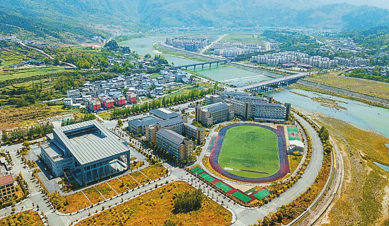 由浙江援建、总投资五点九亿元的青川县智慧岛教育园区主要由﹃三校、一馆﹄组成,是广元市职业技术培育基地。本报记者何海洋摄