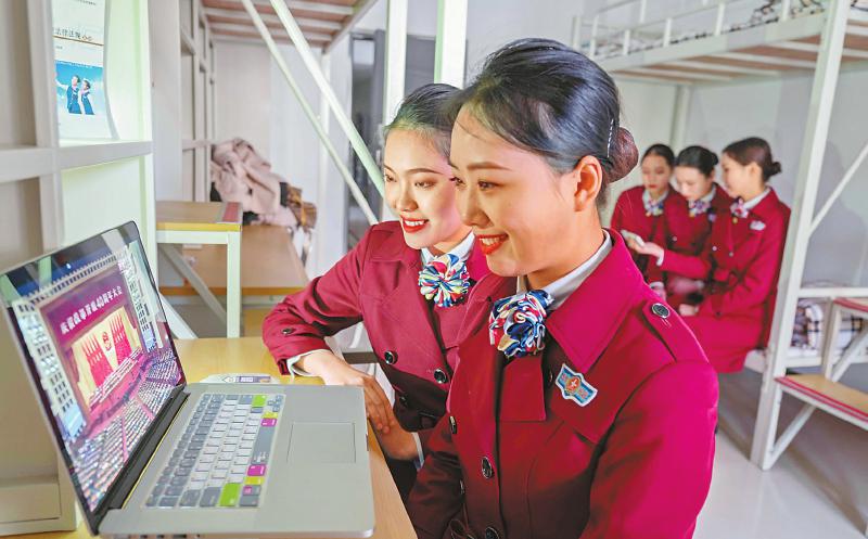 天府新区航空旅游职业学院的学生们通过电脑和手机观看庆祝改革开放40周年大会盛况。本报记者 李向雨 摄