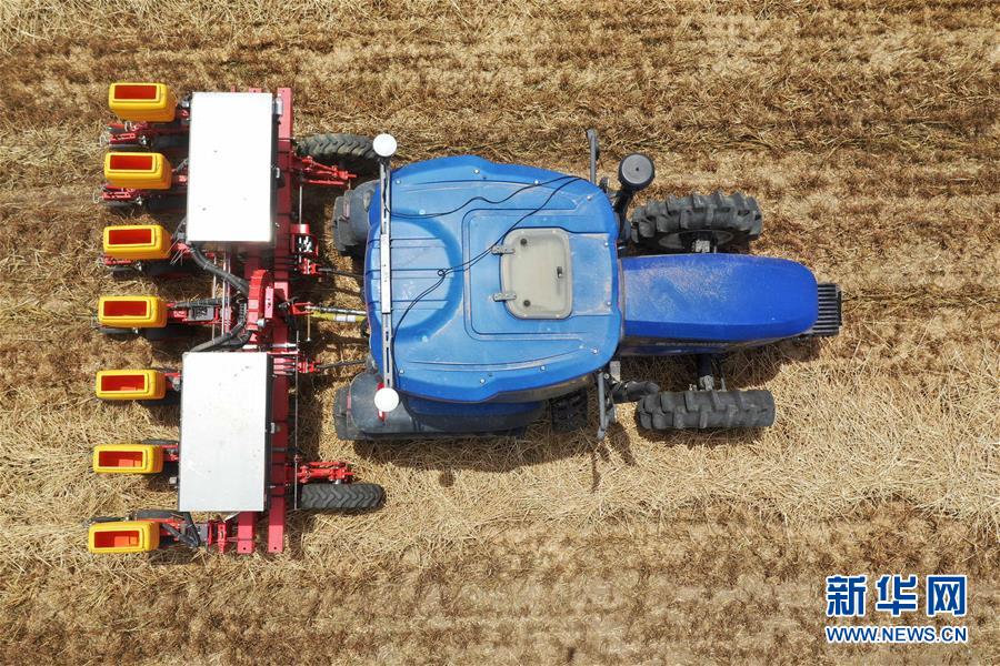 在河南省邓州市小杨营镇安众村,加装有北斗导航系统的拖拉机在无人驾驶状态下播种(2020年5月26日摄,无人机照片)。新华社记者冯大鹏摄