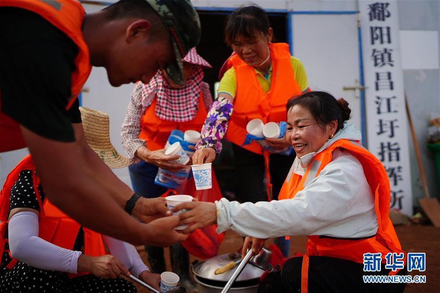 村民余风英是这支“阿姨团”的队长,“我们之前都是一起跳广场舞的‘舞友’,洪水来了,看到这么多救援人员来帮我们修圩堤,我们也要尽一份自己的力量。”