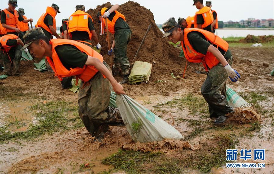 7月11日,武警战士在江西省鄱阳县鄱阳镇江家岭村搬运沙袋。 新华社记者 周密 摄
