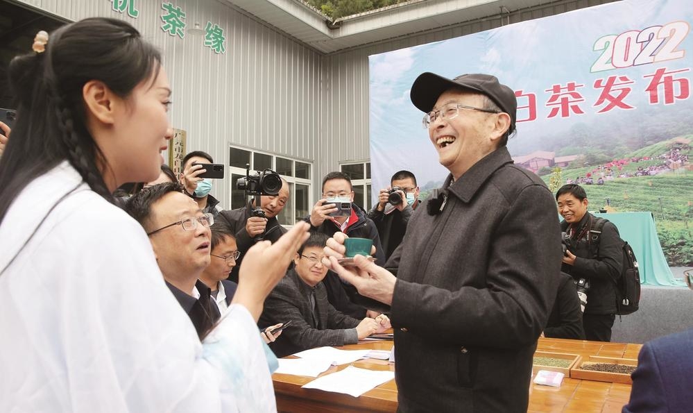 2022年3月24日,青川“白叶一号”开采上市,当地群众将第一杯新茶敬给白堃元。