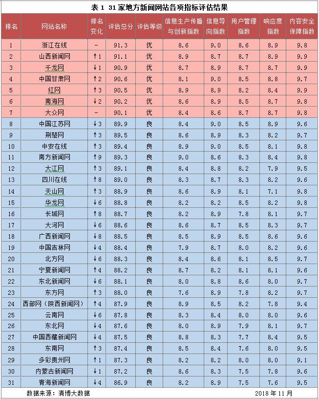 地方新闻网站生态持续改善,生态表现优秀的网站数量连续两月增加。31家地方新闻网站评估总分均值88.9,环比上升0.6%。其中,信息导向指数环比增长2.2%,积极弘扬主旋律正能量。31家地方新闻网站中有7家地方新闻网站生态优秀,较上月增加1家。浙江在线、山西新闻网、千龙网信息生产与创新能力较强,采用动画、动漫或网络广播剧等新闻形式,嵌入直播等技术手段,评估总分位居前三甲。南方新闻网、四川在线、长城网刊载正能量主动性增强,融媒体能力表现亮眼,排名大幅提升。