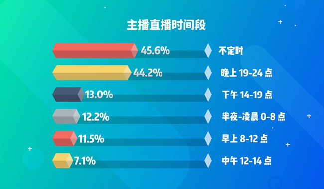 由于观看直播用户的高峰时期均在闲暇时间,如下班后,主播的工作时长通常在晚上。数据显示,44.2%的主播会在19:00-24:00直播,60.1%的职业主播在这一时段直播。在直播时长方面,17.3%的职业主播每天直播时长超过8小时。男性主播比女性主播能吃苦,10.6%的男性主播每天直播时长超过8小时,女性这一比例为5.5%。