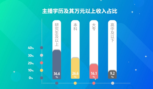 数据显示,职业主播中大学以上学历(含大专)占比为44.5%。而主播的收入与学历成正比,学历越高收入越高。36.6%的研究生以上学历主播月收入过万,26.6%的本科学历主播月收入过万,16.1%大专学历主播月收入过万。
