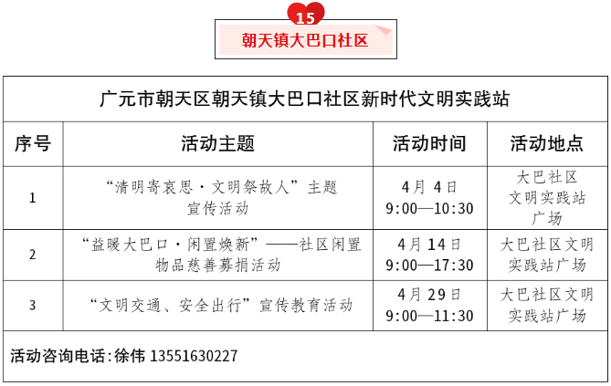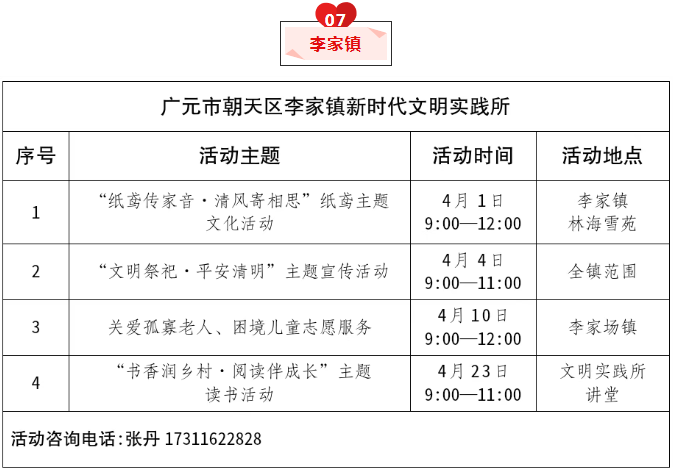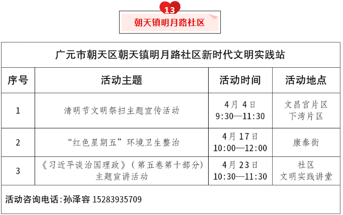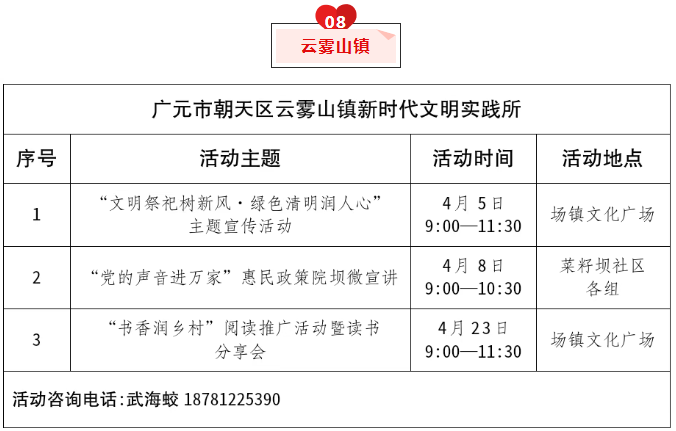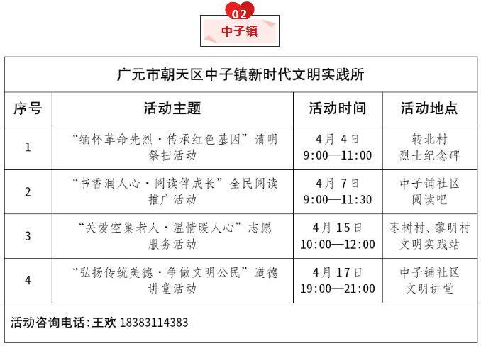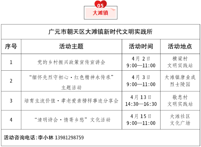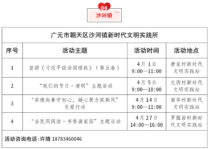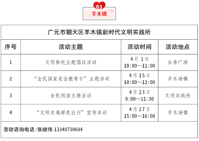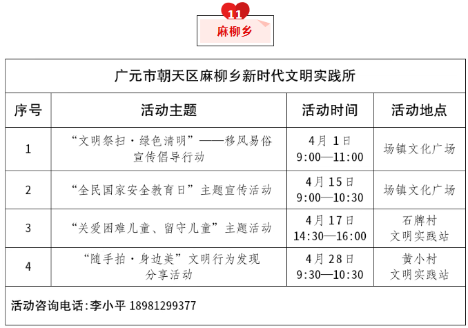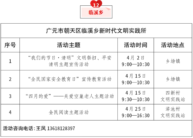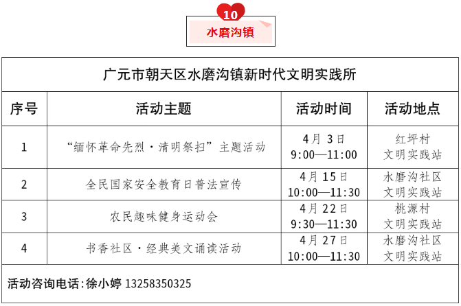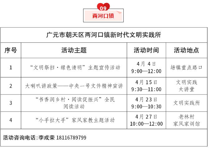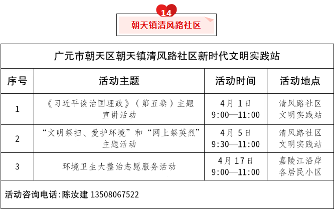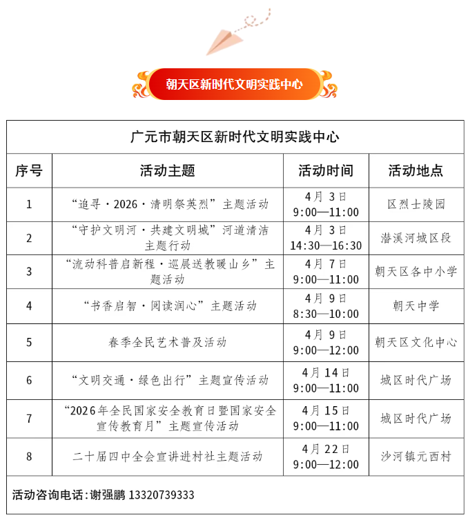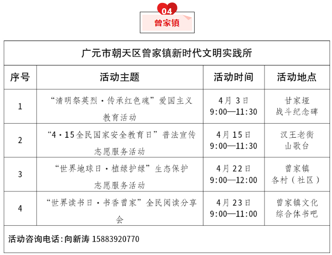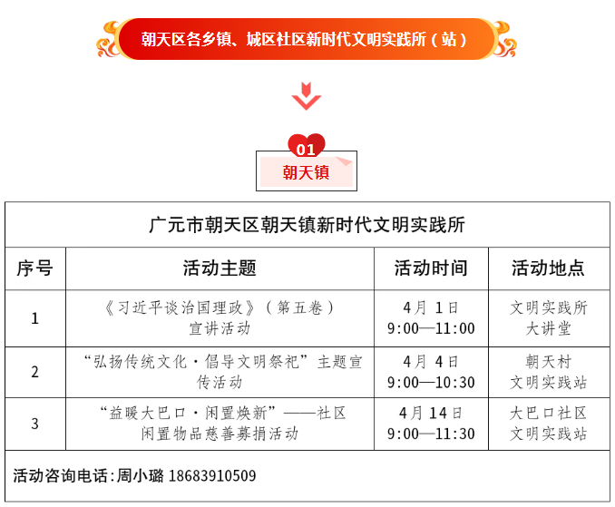 为推动新时代文明实践活动提质增效,充分发挥新时代文明实践中心(所、站)作用,现将朝天区新时代文明实践中心(所、站)2026年4月份部分活动计划清单公布如下: