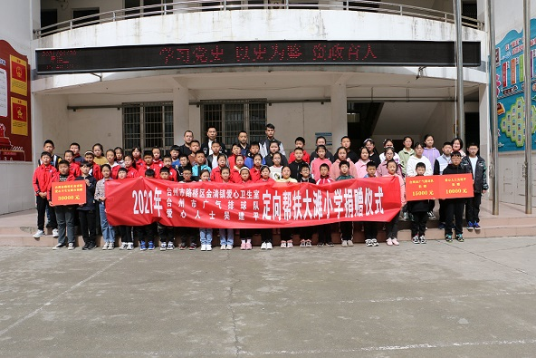 “关爱山区儿童,山呼海应献爱心”,近日,台州市路桥区金清镇爱心卫生室、台州市广气排球队、爱心人士吴建平在大滩小学举行了定向帮扶捐赠仪式,现场为大滩小学捐赠5.5万元。受益学生287人。
