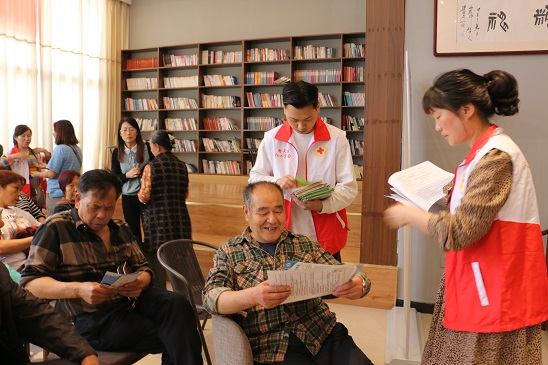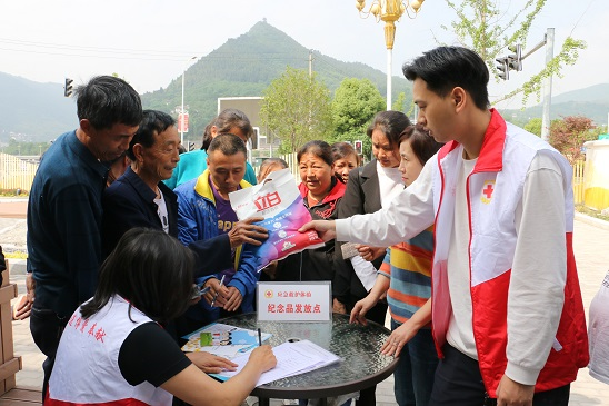 (红十字志愿者为参加现场体验的居民发放宣传资料和小礼品)