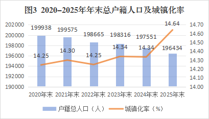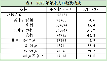 人口规模保持稳定。据公安部门人口年报统计,2025年末,全区总户数68606户,户籍总人口196434人,其中乡村人口167674人,城镇人口28760人,户籍人口城镇化率为14.6%。按性别分,男性人口101649人,女性人口94785人,人口性别比(以女性为100,男性对女性的比例)为107.24。按年龄分,0-17岁27269人,18-34岁43941人,35-59岁78076人,60岁及以上47148人。全年出生人口1193人,人口出生率6.1‰,死亡人口1817人,人口死亡率9.2‰,人口自然增长率-3.2‰。