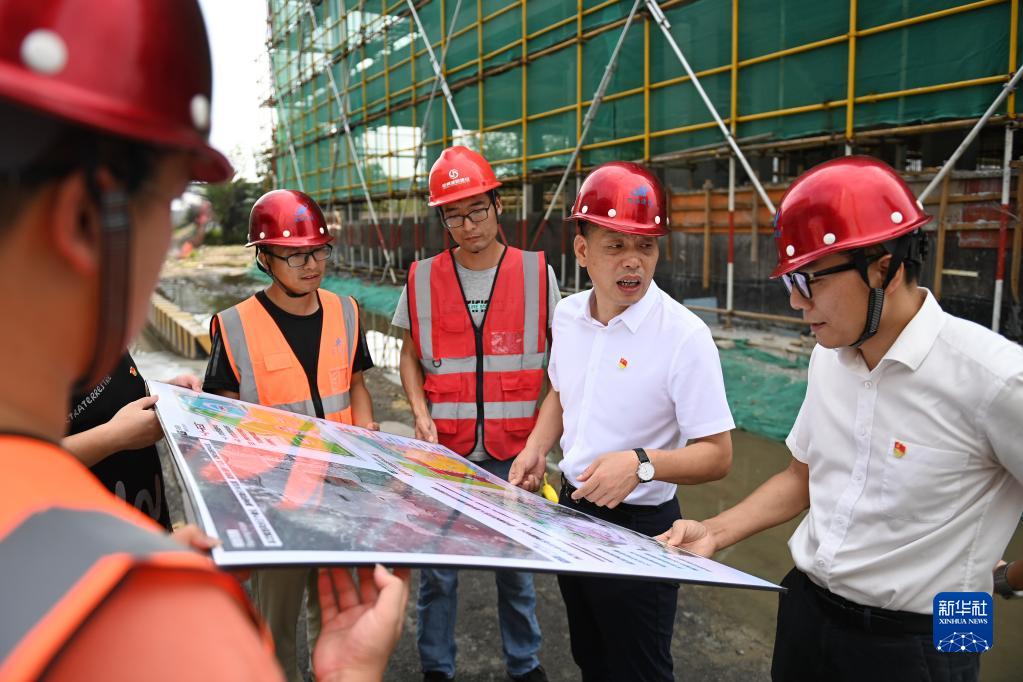 在浙江省宁波市奉化区萧王庙街道滕头村,傅平均(右二)在村党群服务中心大楼建设工地察看施工进展(9月16日摄)。新华社记者 黄宗治 摄