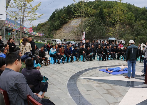 区红十字会工作人员将人体模具放置在村委会广场的水泥地板上,急救讲师站在人体模具后方,转斗乡黎明村的老百姓呈半圆围坐在讲师旁边,急救讲师以“话家常”的方式现场对村民作了应急救护知识与技能的解说和要领示范。一是“救命黄金时刻”自救互救刻不容缓。师资以我国每年320万人中有87%的人因救护不及时而最终失去生命的现象,告诉村民急救前6分钟尤为重要,被称为“救命黄金时刻”,而传统急救依靠打120,等待医生赶到救护,地处山区的老百姓遇到危难往往容易错过这样的黄金时刻,因此掌握一定的急救技能能给生命一次新生的奇迹。二是创伤救护不容忽视。师资以基本技能要领的讲解和与村民互动参与的方式,对止血、包扎、固定、搬运四项技术进行讲解,现场细致分解示范头部、胸部、手臂、大腿等部位的止血及各类包扎办法及要领。三是心肺复苏紧迫重要。师资从判断伤病员意识、呼吸、心跳三无到正确呼救,再到胸外心脏按压、打开气道、人工呼吸的有效的手法和注意事项等作了通俗的讲解、示范和互动。四是突发事故处置科学合理。区红十字会讲师对车祸、蛇伤、酒精中毒、食物中毒、气道异物梗塞等生活中常见的突发事故处置通过讲故事的办法进行了详细讲解和示范,并与村民开展了积极互动。
