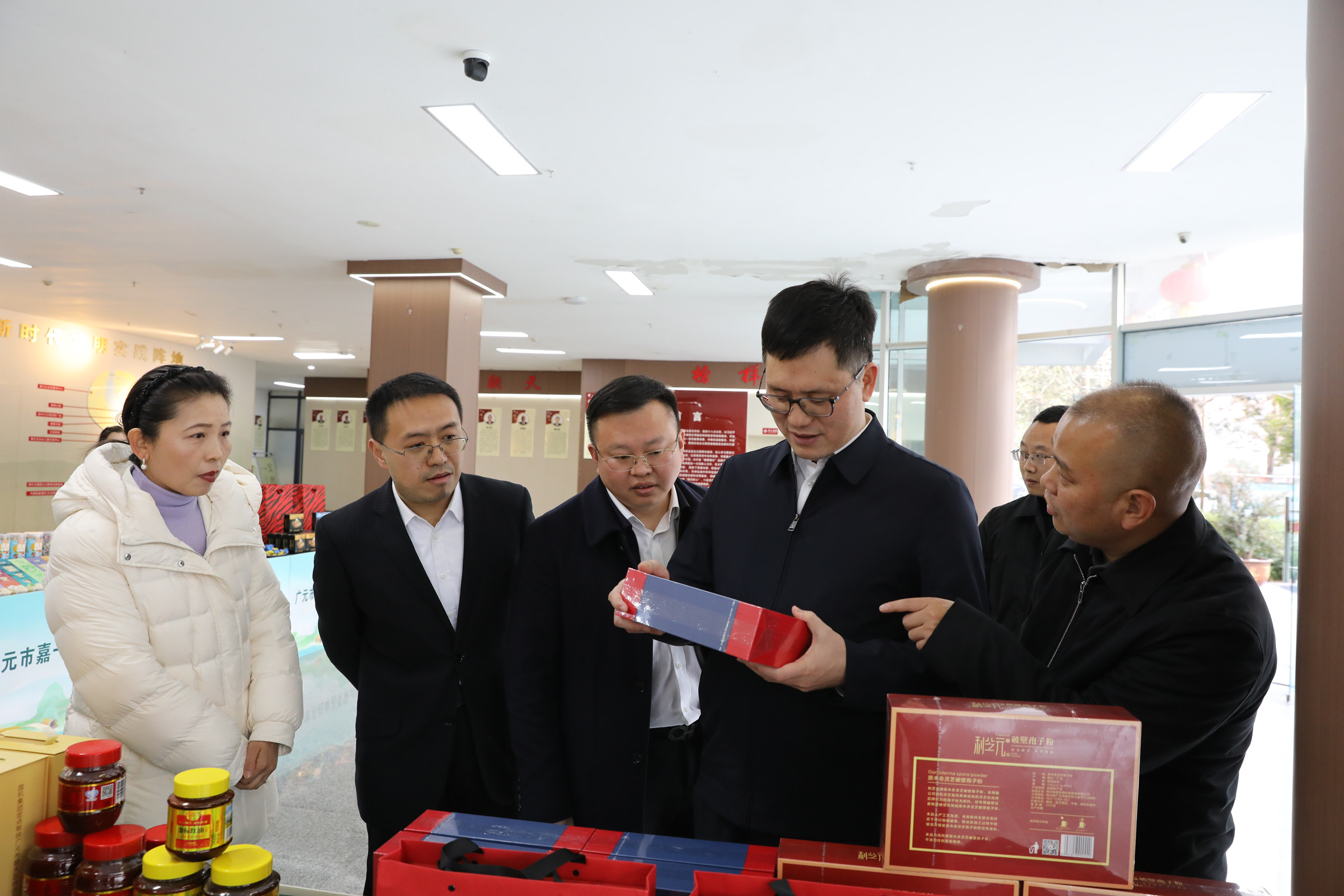 茶叙会前,郭祖炎、李磊一行参观了我区部分特色商品展。
