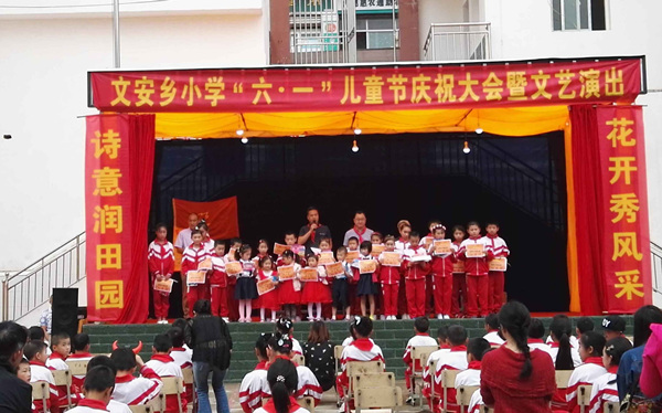 开展捐资助学活动。联合成都市广播电视台和建行广元分行青年志愿者开展捐资助学活动,为文安小学捐建音乐器材8大类120多件,送去“爱心包裹”109个。开展宣誓和表彰活动。组织新入队的20余名少先队员进行宣誓,表彰了“优秀少先队员”、“优秀艺术人才”、“优秀运动员”等5个奖项23名小学生。组织开展了以“诗意润田园,花开秀风采”为主题的文艺演出,表演了诵读《弟子规》、舞蹈《大王叫我来巡山》等各类节目15个。