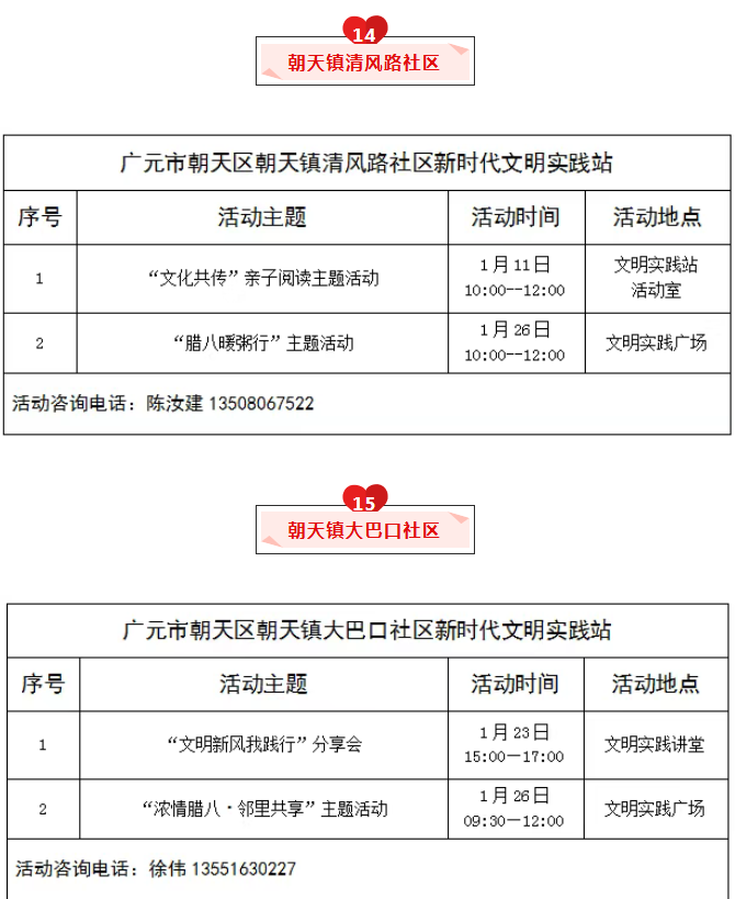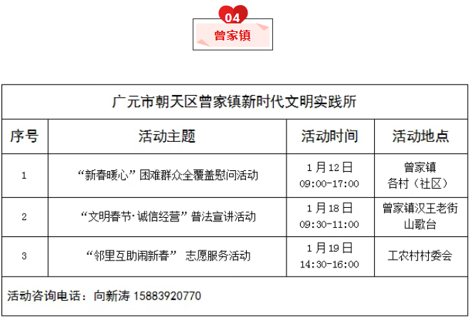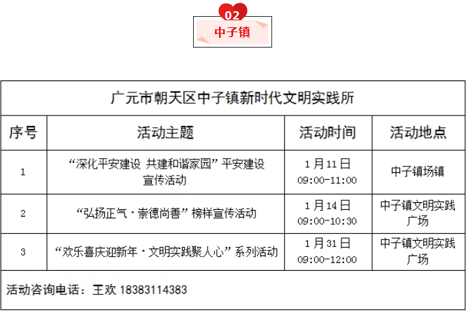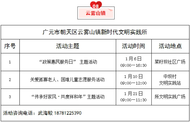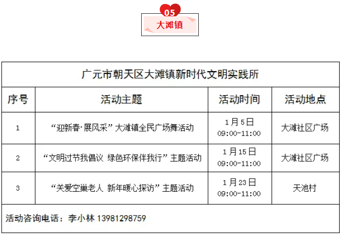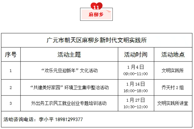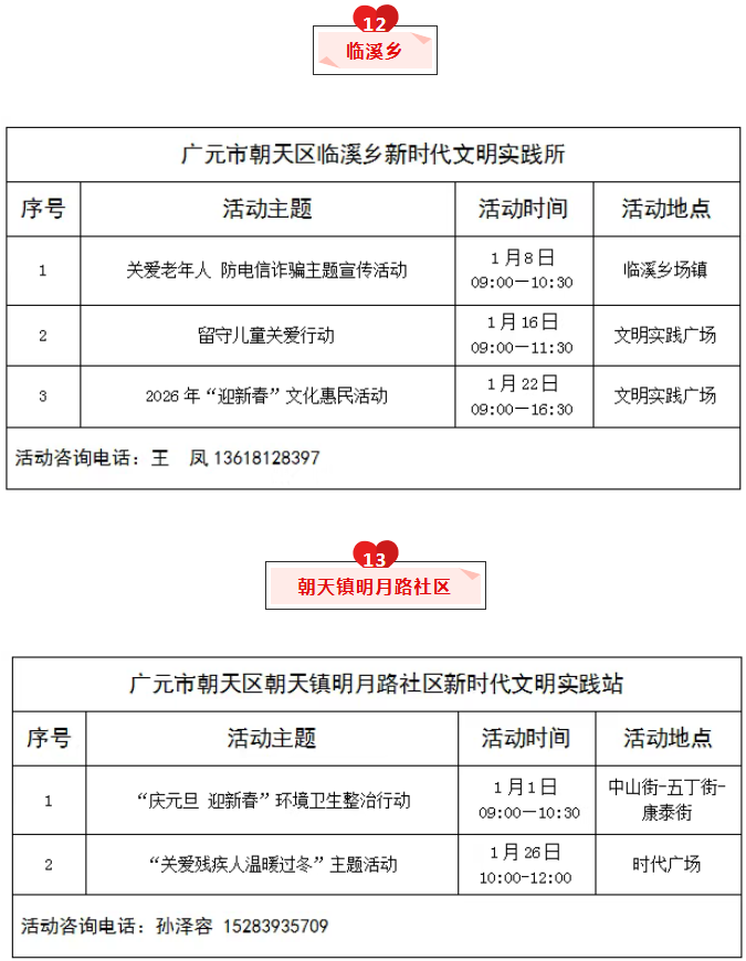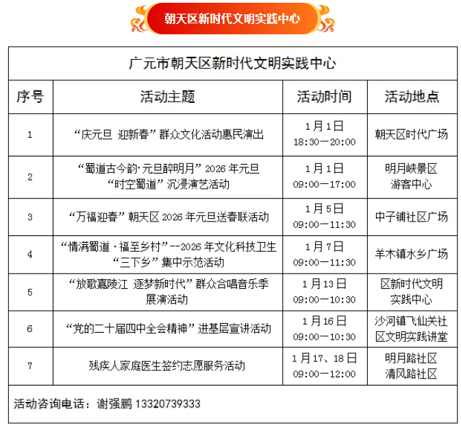 为推动新时代文明实践活动提质增效,充分发挥新时代文明实践中心(所、站)作用,现将朝天区新时代文明实践中心(所、站)2026年1月份部分活动计划清单公布如下,欢迎广大群众积极参与。