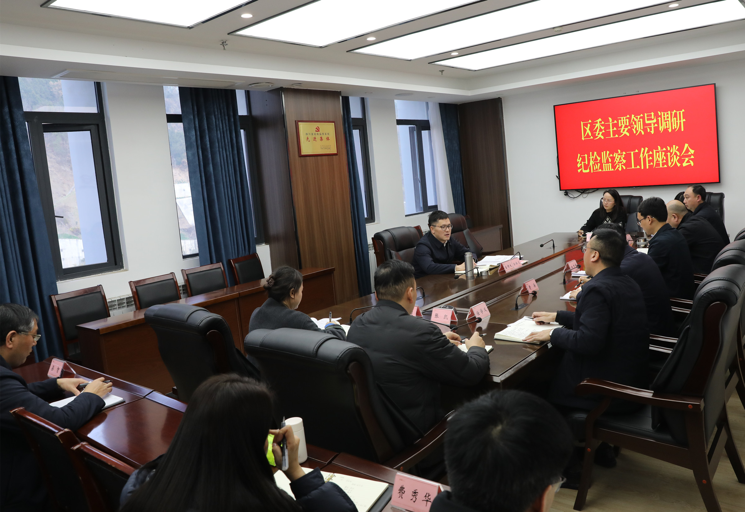 在随后召开的座谈会上,郭祖炎听取了区纪委监委机关、区委巡察办机构基本情况介绍以及区纪委监委、区委巡察办工作开展情况汇报。他指出,区委区政府将“抓发展”作为首要政治任务,把重点项目建设、产业培育作为首要任务,把投资拉动和产业发展作为关键举措。纪检监察机关作为政治机关,要把“两个维护”作为最高政治原则和根本政治规矩,将政治监督融入经济社会发展全过程,确保各项决策部署落地生根、取得实效,确保区委“抓发展”的决策部署不偏向、不变通、不走样。要坚持严的基调,聚焦重点民生领域,持续深化集中整治,做到敢于亮剑、善于斗争,切实解决好群众的“急难愁盼”,让人民群众真切感受到全面从严治党就在身边,不断增强获得感、幸福感、安全感。要学深悟透习近平新时代中国特色社会主义思想,保持“永远在路上”的清醒和坚定,牢记“廉洁自律就是最大的底气”,以纪检监察工作规范化法治化正规化建设为抓手,练就过硬本领,打造一支忠诚干净担当的“纪检铁军”。