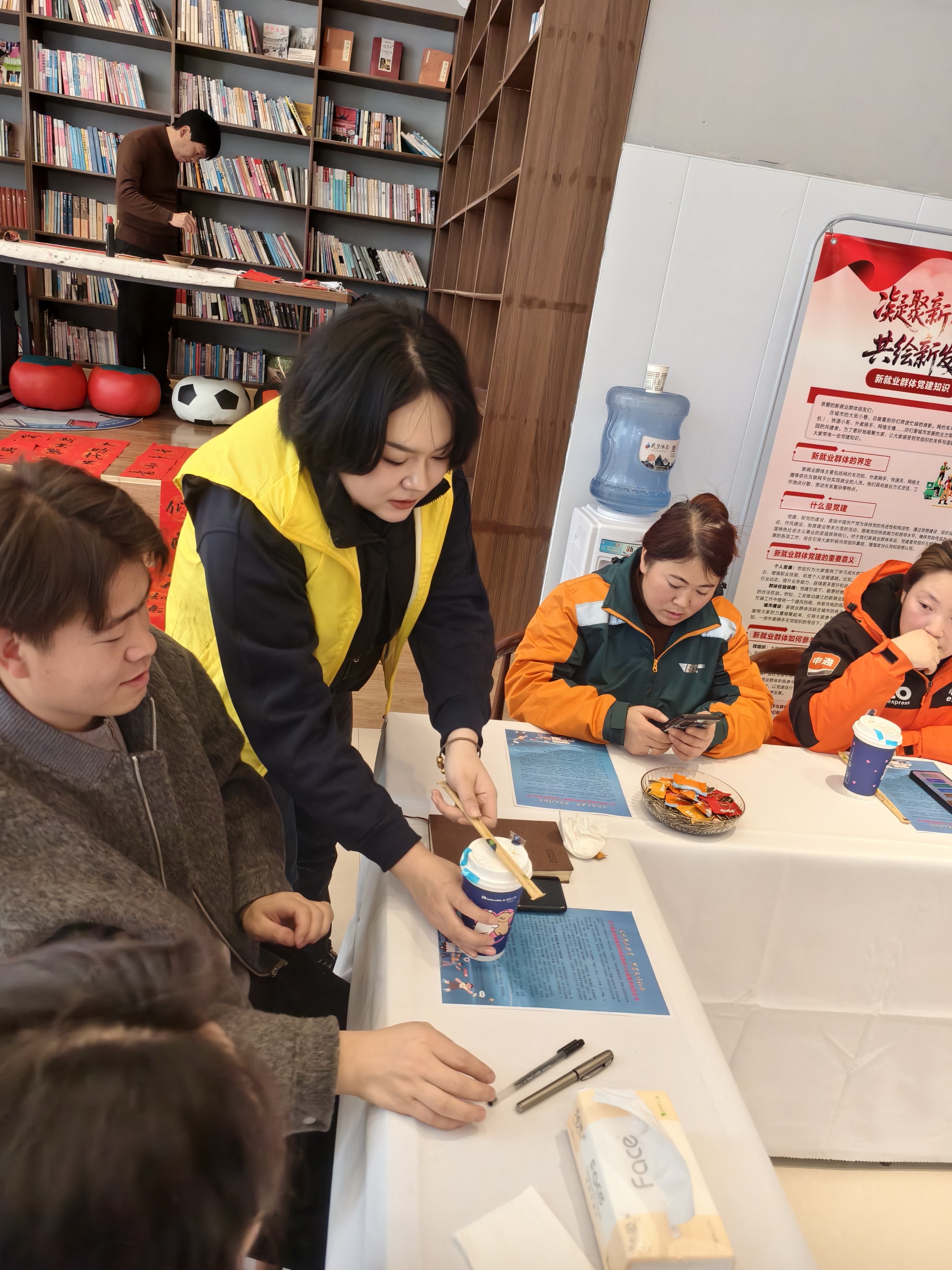 本次活动以党建引领为核心,创新设置多元互动场景,让慰问更具温度与实效。活动伊始,精心布置的“时光启愿墙”前,新年糖果与新鲜水果整齐摆放,瞬间让奔波在外的新就业群体代表们卸下了疲惫。作为活动的一大创新亮点,“身份互换”环节格外引人注目:新就业群体代表化身“点餐人”,在定制饮品卡上勾选心仪口味;区委社会工作部的党员干部则主动切换角色,变身“专属外卖员”,从细心核对订单到双手送达外卖,每一个动作都传递着对新就业群体的共情与尊重。“平时都是我们给别人送餐,今天能被党员干部贴心服务,真切感受到自己的工作被看见、被重视!”外卖骑手赵慧手捧热奶茶,脸上洋溢着灿烂的笑容。