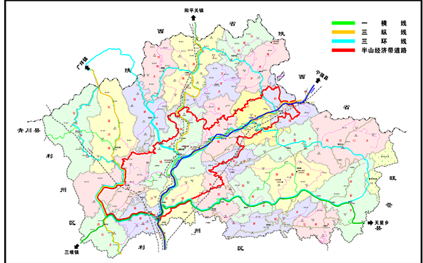 “要得富,先修路。”建区以来,特别是近年来,朝天区始终将交通建设作为经济社会发展先手棋,作为经济社会发展的“主引擎”和“压舱石”,积极主动承接国家交通大动脉,构建形成铁路、高速公路、国省干线、通用机场的外部交通体系。始终保持超前谋划交通项目、超速推动项目、超常管理项目,累计实施公路建设3000余公里,实现了100%的乡(镇)通水泥路(油路),率先在全市实现了100%的村通4.5米水泥路,通组硬化率高达95%,全面形成了“一横三纵三环线”主骨架路网及完善的村组公路“毛细血管”的内部体系。
