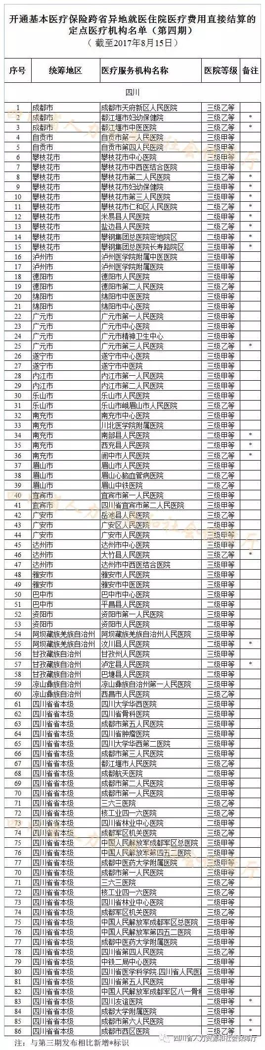 四川新闻网成都8月21日讯(记者 李丹)21日,四川新闻网记者从四川省人社厅获悉,全国跨省异地就医住院医疗费用直接结算联网接入工作顺利推进。近日,人社部发布基本医疗保险跨省异地就医住院医疗费用直接结算公共服务信息(第四期)。四川有86家定点医疗机构接入国家异地就医结算系统。