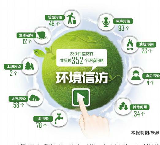 按照属地管理原则,信访件转交相关市州政府组织办理。第十五批信访件从地区看,成都市共95件,此外还有6个市的投诉超过10件,分别为绵阳市19件、乐山市15件、德阳市13件、达州市11件、内江市10件、南充市10件。230件群众来电来信信访件共反映352个环境问题,其中涉及水污染78个、大气污染58个、土壤污染2个、生态破坏12个、垃圾污染48个、噪声污染93个、油烟污染23个、扬尘污染4个、其他问题34个。