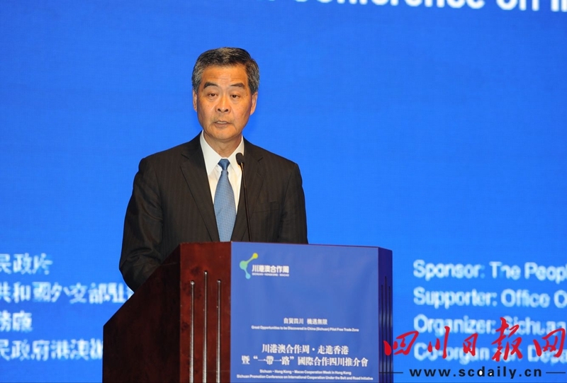 梁振英在致辞中说,“一带一路”倡议是关于国际合作的倡议,香港是中国最国际化的城市之一,因此是“一带一路”倡议的重要节点。在“一带一路”倡议逐步实施的过程中,香港愿意发挥作用,和内地兄弟省市分享国际联系、国际交往能力和国际经验。长期以来,香港和四川省有着广泛、密切和互利的合作关系。四川是古代南方丝绸之路的起点,今天在新的国际合作的大气候下,四川省拥有同样独特的优势,相信香港和四川省可以进一步合作,发挥双方各自的独特优势,用好“一带一路”国际合作倡议带来的新机遇,促进两地和国内外伙伴的共同发展。