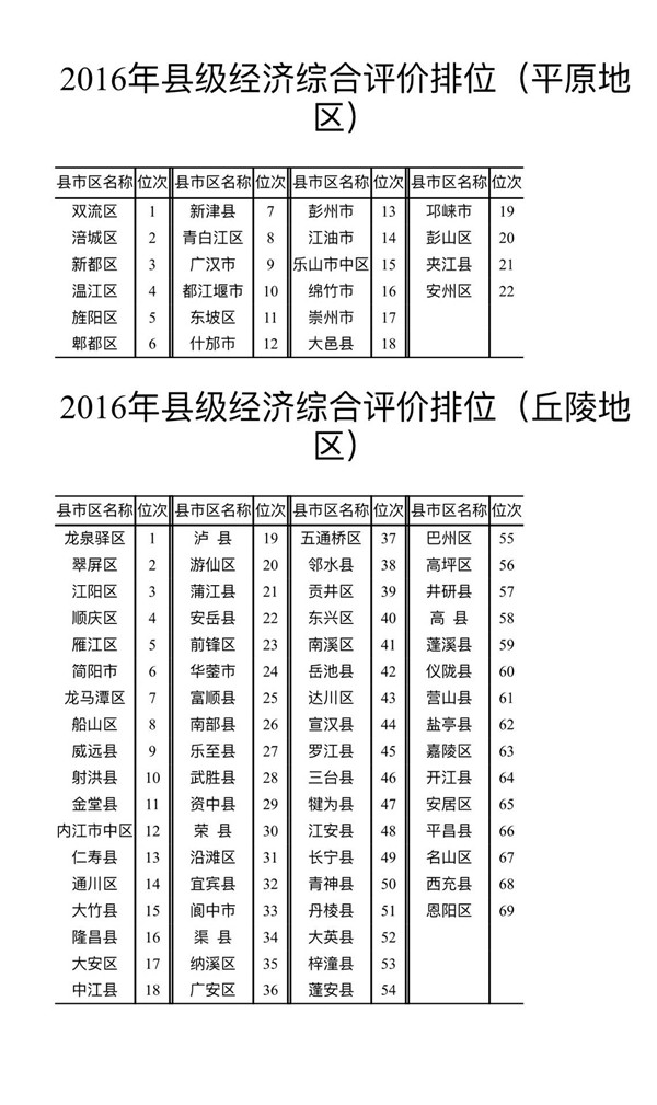 四川新闻网记者从会上了解到,根据《中共四川省委办公厅、四川省人民政府办公厅关于进一步加强县级经济综合评价工作的通知》(川委厅〔2003]6号)确定的县级经济综合评价办法,遵循科学性、客观性和可比性等原则,四川省统计局从经济规模、发展水平、经济结构、发展速度、经济效益等五个方面,对2016年全省175个县、市、区(成都市青羊区、武侯区、金牛区、成华区、锦江区,攀枝花市东区、西区和自贡市自流井区等8个区未纳入评价范围)的经济发展情况进行了综合评价。