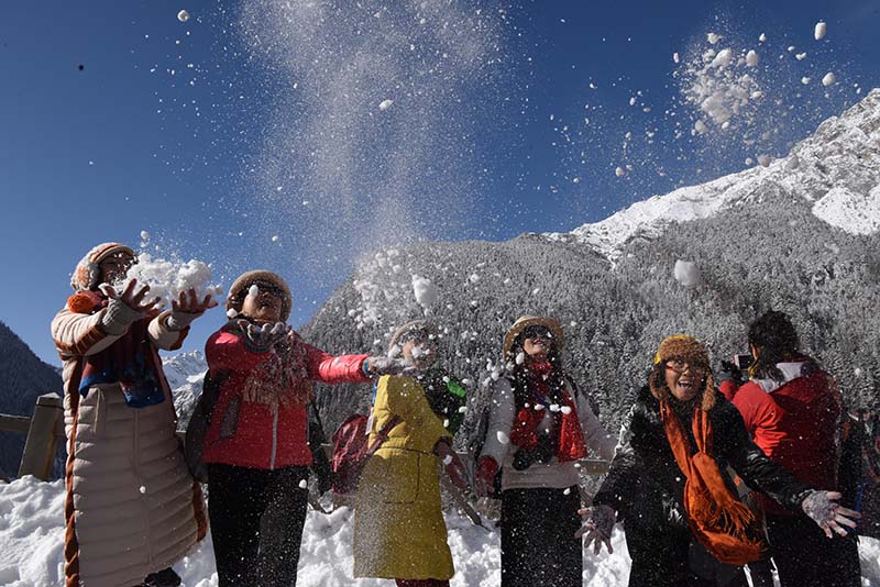 游客景区内戏雪,兴奋之情溢于言表。