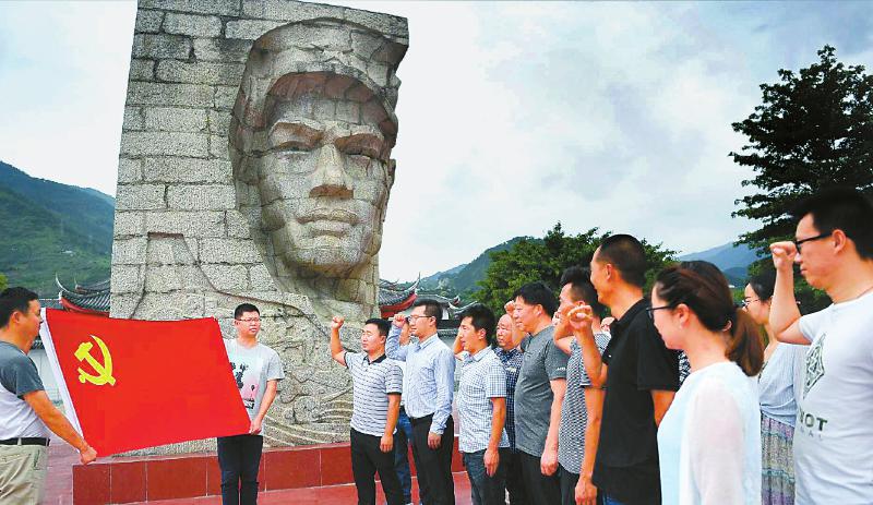 位于石棉县的安顺场中国工农红军强渡大渡河纪念碑前,党员干部在党旗前宣誓,开展“不忘初心、牢记使命”主题教育。本报记者衡昌辉摄(资料图片)