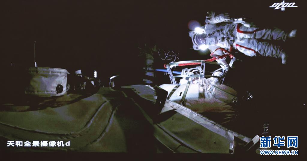 7月4日在北京航天飞行控制中心大屏拍摄的神舟十二号乘组航天员刘伯明、汤洪波在舱外工作场面。新华社记者 金立旺 摄