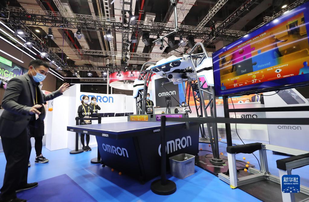 在第三届中国国际进口博览会期间,一名男子体验与欧姆龙公司的一款乒乓球教练机器人对战,右侧屏幕上实时显示他的心率和情绪指数(2020年11月5日摄)。新华社记者 方喆 摄